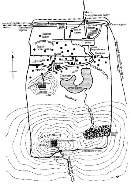 Над новым каменным карьером, немного поодаль от Леопардового холма, стоял Королевский дом: прямоугольное здание с огромным залом посередине и коридорами с рядами комнат по периметру — в прошлом оно служило казармой, но сейчас предназначалось для других целей и для другого обитателя. Рядом, к северу от кипарисовых садов и озера Крюк, находилось многочисленное скопление каменных зданий, напоминавших дома на Квизо, но более крупных. В иных из них жили высокопоставленные ортельгийцы, другие отводились для заложников или делегаций из разных провинций, прибывавших с петициями к королю или генералам чуть не каждый день в это тревожное время, когда империя вела войну за спорные приграничные территории. Обнесенная каменной оградой дорога вела за кипарисовые сады к Павлиньим воротам, единственному проходу в крепостной стене, отделяющей нижний город от верхнего.