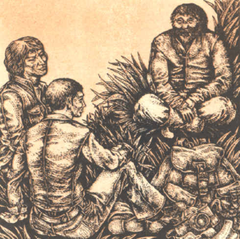 Действительно, минут через двадцать, когда котелок с аппетитным запахом заменили закопченным чайником, сверху спустился сморщенный старичок с реденькой пегой бородкой. Одет он был в нечто мешковатое, кожаное, за спиной торчал кожаный же мешок. Из всей экипировки бурята Саша смог бы назвать только старенький винчестер и ганзу — короткую медную трубку.