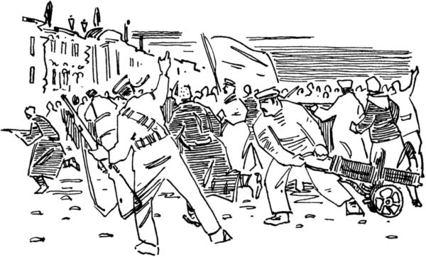 На колёсиках по тротуару прокатился пулемёт, и Пашка не выдержал. Как был, босиком, он петухом взвился на чердак. Отсюда из слухового окошка было видно и слышно далеко-далеко. По Дворцовой площади мчались броневики, из-за ограды Зимнего дворца трещали выстрелы. Чёрной железной колонной, ощетинясь винтовками, шли по Невскому проспекту матросы. Грузовики с солдатами торопились по направлению к Смольному, красные знамёна так и полоскались по ветру…