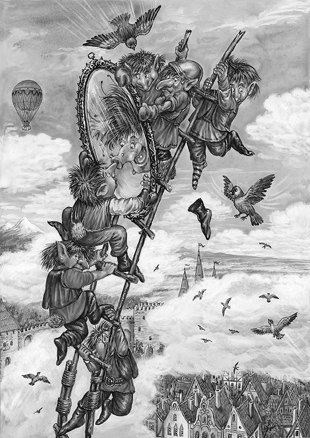 И вот они бегали с зеркалом повсюду; скоро не осталось ни одной страны, ни одного человека, которые бы не отразились в нём в искажённом виде. Напоследок захотелось им добраться и до неба, чтобы посмеяться над ангелами и самим Творцом. Чем выше поднимались они, тем сильнее кривлялось и корчилось зеркало от гримас; они еле-еле удерживали его в руках. Но вот они поднялись ещё, и вдруг зеркало так перекосило, что оно вырвалось у них из рук, полетело на землю и разбилось вдребезги.