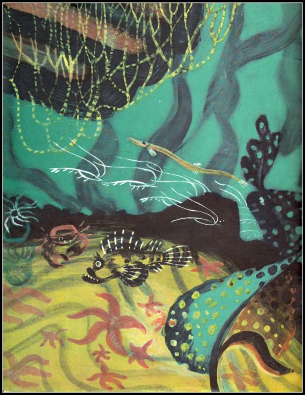 Когда Дельфинёнок проснулся, он увидел другого дельфинёнка — тот гнался за длинной рыбой-иглой.