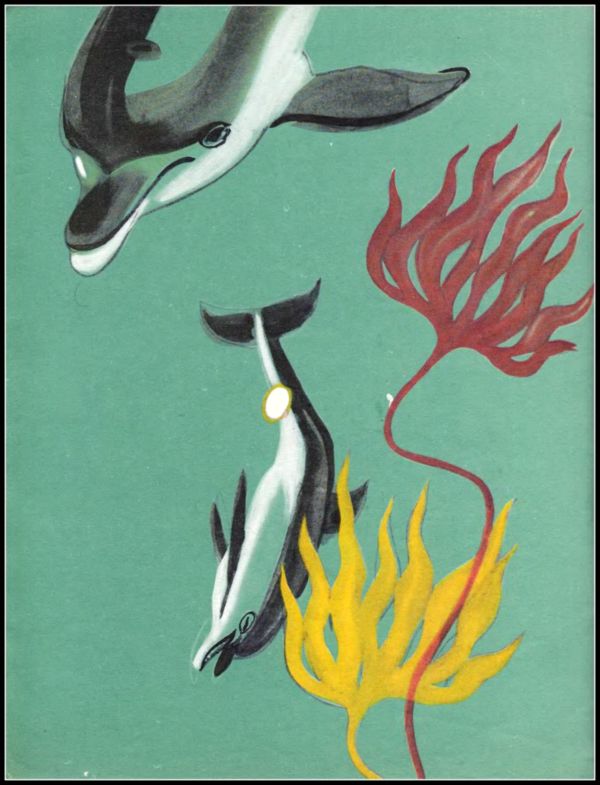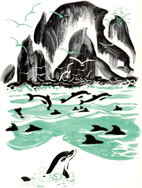 Если бы на них посмотрели люди, они не смогли бы разобрать, какая разница между ними тремя — разве что один покрупнее. У всех были тёмные спины, ослепительно белые животы и выпуклые лбы. А между тем рыльце Дельфинёнка было чуть короче, шире и имело наивное, доверчивое выражение. Физиономия того, что держал рыбу за хвост, была острее, зрачки шныряли по сторонам, и всякому сразу становилось ясно, что его мама ещё хлебнёт с ним горя.