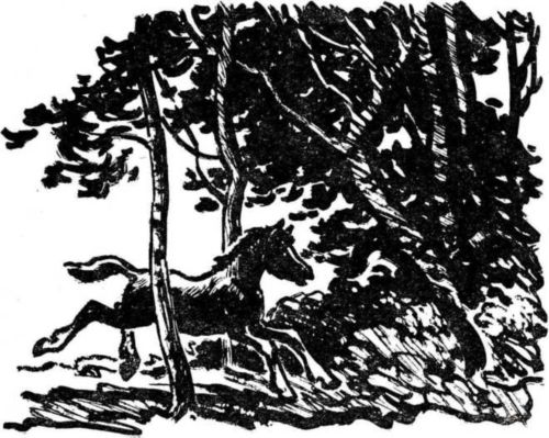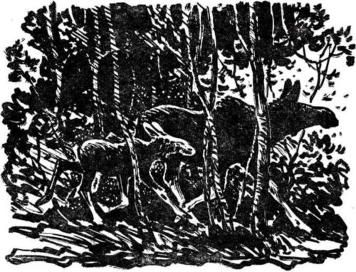 С дороги свернули в чащу. Лосиха, ломая кусты, шла впереди, беспокойно оглядываясь. Она знала и не боялась лошадей, понимала и то, что Латуня ещё маленький; но зачем он идёт за ними, этого она не могла понять. Что, если он обидит её телёнка? Она отлично видела, как низко стоящий на ногах Латуня, толстый и неуклюжий по сравнению с её длинноногим, поджарым телёнком, с трудом продирается сквозь кустарник, и всё ускоряла ход, надеясь, что он отстанет. Но Латуня не отставал. Он царапал грудь о ветки, вскидывал головой, обивал на кочках копыта и мчался из последних сил, стараясь не потерять из виду мелькавший перед ним светлый задок своего нового знакомого.