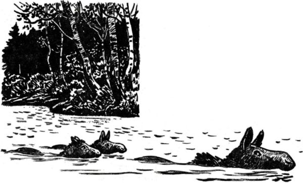 Латуня ещё ни разу не плавал, но ему не было страшно. Он, как и всегда, был уверен, что с ним не может случиться ничего плохого, и, хотя приходилось судорожно работать ногами и высоко задирать голову, чтобы не нахлебаться, он весело косился на лосёнка и старался плыть так, чтобы касаться его боком.
