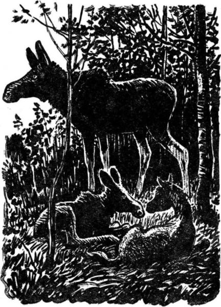 Вернулись в лес. Тут, в глухом осиннике, под раскидистым, окружённым кустами деревом, было лежбище — примятая трава и белевшие во тьме обглоданные стволы молодых осин. Лосёнок, сгибая пополам тонкие ножки, лёг, лосиха встала над ним. Латуня повалился тут же, придавив ей копыто, и она нервно переступила всеми четырьмя ногами.