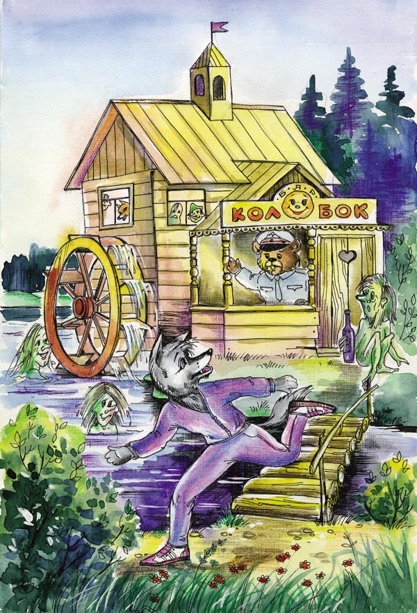 В старой мельнице расторопный Рыжий Лис открыл бар «Колобок». Когда-то это было литературное кафе с тем же названием, но его прежние владельцы, Бабка с Дедом, не смогли устоять под напором рэкетира Лиса и отдали своё любимое заведение на «съедение».