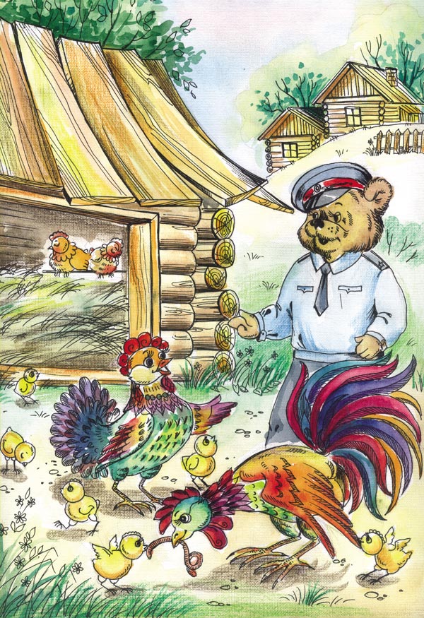 Михайло Потапыч попытался было расспросить других обитателей курятника, но они закудахтали так громко, что просто оглушили медведя. Он только понял, что на тот момент, когда снесла Ряба яйцо, все спали.