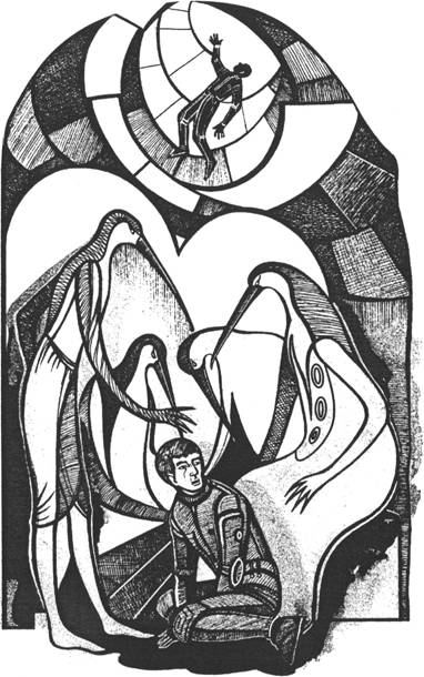 Мейрджайн — отнюдь не необитаемый мир. Его забросили в собственное прошлое, затем в будущее (не было времени задуматься над инструкциями бортовому роботу и тем, что в будущем могли они значить). А следовательно, существа, обитавшие здесь, овладели секретом путешествий во времени, и были то, наверное, те самые ибисоголовые, которых он углядел в глубине времякристалла.