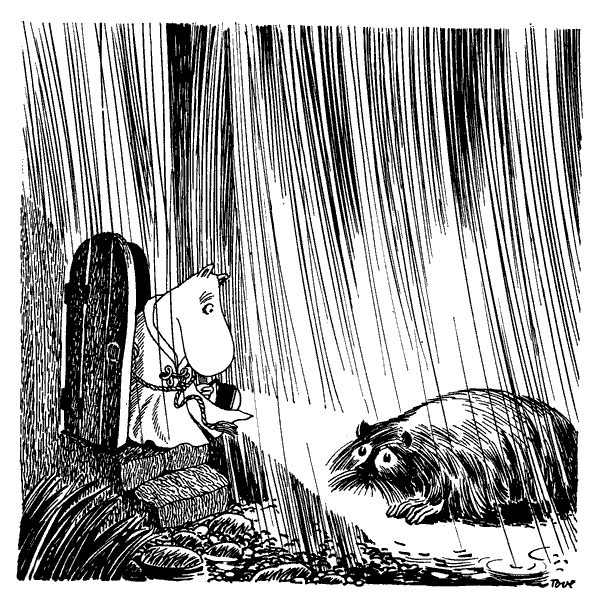 – «Надеюсь, хотя бы не ливень», – подумала Муми-мама, собрала оставшиеся ракушки и вошла в дом как раз в ту минуту, когда с неба упали первые капли.