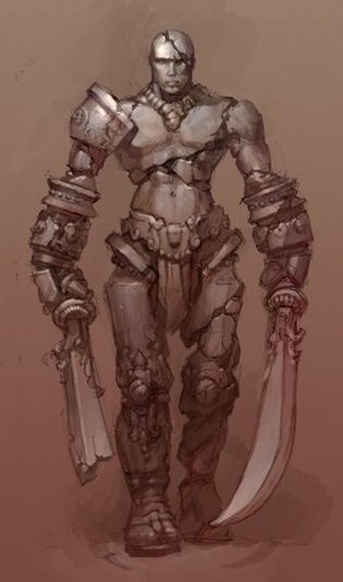 Каменный Великан беззвучно прошевелил губами «Я. Не. Монстр», обернулся и с любопытством оглядел железного человека ростом ниже его на голову, вооруженного двумя фальшионами — кривыми мечами. По торсу и черепу его тут и там змеились глубокие трещины, перехваченные грубыми стяжками: старику пришлось повидать немало схваток на своем веку. Сколы, царапины, вмятины усеивали тело голема, словно какой-то неумный шутник попытался когда-то пропустить его через мясорубку. Местами железо начала подъедать ржавчина. Под весом оружия соперник, казалось, сутулился, и взор его, тусклый и отстраненный, был устремлен в одну точку.