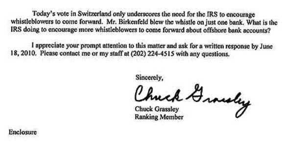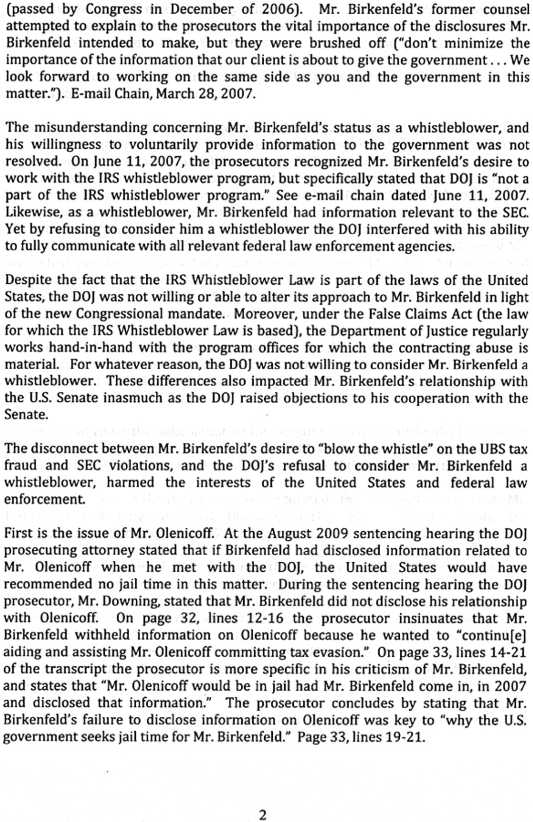 Несмотря на то что законопроект IRS по работе с изобличителями является полноценным законом Соединенных Штатов, министерство юстиции не желало или не могло изменить свой подход в отношении мистера Биркенфельда в свете нового распоряжения, выпущенного Конгрессом. Более того, согласно закону о неправомерных претензиях (на котором основаны положения закона о работе с изобличителями) министерство юстиции должно регулярно тесно сотрудничать с ведомствами, призванными расследовать подобные злоупотребления. По какой-то причине министерство юстиции не желало считать мистера Биркенфельда изобличителем. Это повлияло на взаимодействие мистера Биркенфельда с Сенатом США и проявилось в том, что министерство юстиции возражало против его сотрудничества с Сенатом.