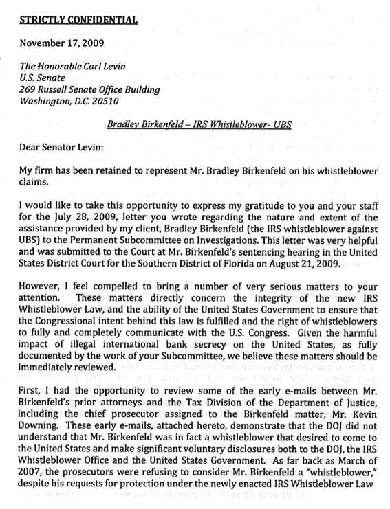 Я бы хотел воспользоваться предоставленной мне возможностью и выразить благодарность вам и вашим сотрудникам за письмо от 28 июля 2009 г., в котором вы описали суть и масштаб помощи, оказанной моим клиентом, Брэдли Биркенфельдом (изобличителем деятельности UBS перед IRS) Постоянному подкомитету по расследованиям. Это письмо очень нам помогло и было представлено во время слушаний относительно приговора мистеру Биркенфельду в окружной суд Соединенных Штатов Америки по Южному округу штата Флорида 21 августа 2009 г.