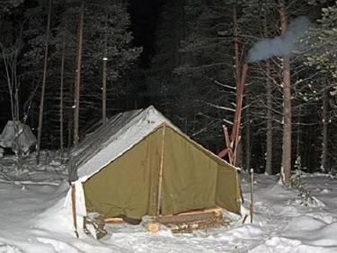 Мы легко расчистили от снега место для палатки, установили печку и рацию, приготовили на печке поесть, поужинали и легли спать.