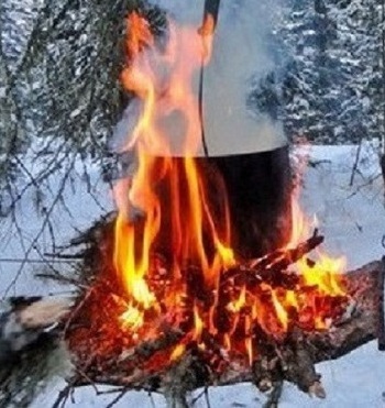 А с утра, позавтракав, принялись за расконсервацию вездехода. Она заключалась в заготовке большого количества горячей воды для пролития через радиатор и разогрева мотора. Для этого у нас была большая бочка из-под бензина. Мы вырубили днище, набили бочку снегом, обложили корягами и толстыми сухими сучьями и подожгли их.
