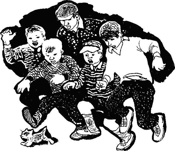 Подходящий двор мы отыскали быстро — совершенно закрытый каменный четырёхугольник. Значит, и кот никуда не убежит, и топот по асфальту будет громкий. И мальчишек во дворе было полно. К сожалению, попали мы туда неудачно — как раз в тот момент, когда большой футбольный мяч со звоном влетел в окно подвала, и мальчишки кинулись врассыпную. Но одного, стриженного наголо, с чёрными дерзкими глазами и содранными коленками, мне удалось поймать за руку.