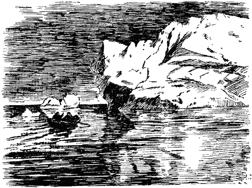 Лодка теперь двигалась вдоль ледника, уступ, представлявшийся издали сплошным ледяным мысом, оказался глетчером, висящим на высоте трех саженей над уровнем моря. Толщина льда у среза была около пятнадцати саженей. На поверхности глетчера, в том месте, где он заметно прогнулся к морю, виднелись глубокие трещины. То там, то здесь по льду бежали серебристые ручейки, стремясь просочиться вниз.