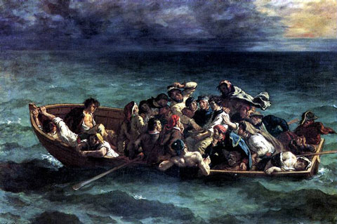 Все остальные лодки потерялиВ начале шторма. Впрочем, и баркасБыл в жалком состоянье и едва лиМог долго продержаться. Но сейчасНе думали об этом: все мечталиЗа борт скорее прыгнуть, чтобы часУрвать у жизни: всем уж ясно стало,Что лодок для спасенья не хватало.49