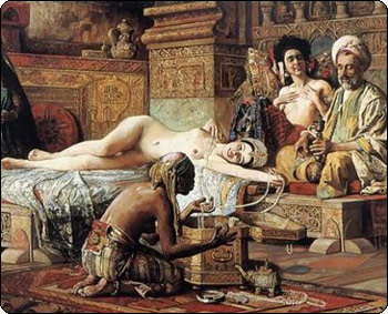 Красавицы роскошно отдыхают,Как пестрые прекрасные цветы,Которые томятся и вздыхаютВ садах волшебной южной красоты.Одна, слегка усталая, являетПрелестное создание мечты,Как нежный плод причудливый и редкий,Свисающий с отяжеленной ветки. 66