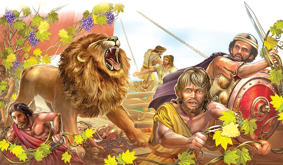 Наконец Дионису надоели эти игры. И тогда на палубу корабля вдруг полилось вино, а вокруг мачты обвились виноградные лозы, густо повисли виноградные кисти, по мачтам побежал плющ. На каждой уключине появился венок. Разбойники таращились на эти чудеса, а тот, кто только что был их пленником, у них на глазах превратился в чудовищного льва. Лев громко зарычал и приподнялся на задних лапах, его глаза грозно засверкали. Разбойники в ужасе бросились один за другим в море. Там все они превратились в дельфинов. Дионис пощадил одного только кормчего. Вот что он сказал ему: «Не бойся, достойный человек, я тебя полюбил. Знай, я Дионис, звонкоголосый бог, моя мать – Семела, возлюбленная Зевса».