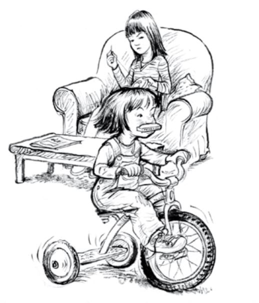 И вот пока Бизус вышивала, Рамона, зажав в зубах губную гармошку, носилась по гостиной на своём трёхколёсном велосипеде. Она сжимала руль обеими руками и так сильно дула в гармошку, что та издавала жуткий звук, словно визгливо восклицала: «Боже! Боже!»