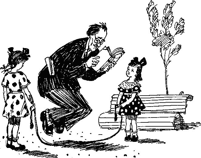Я и прямо, я и боком,С поворотом, и с прискоком…Во двор входит высокий человек. В руках у него свернутые чертежи и книга, которую он держит перед собой и читает на ходу. Девочки стоят в очереди перед вертящейся веревочкой. Высокий человек, продолжая читать, невольно перепрыгивает через веревочку и только тогда понимает, в чем дело, говорит сердито: