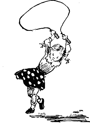 Тут прохожим не пройти,Тут веревка на пути,Хором девочки считаютДесять раз по десяти.Это с нашего двораЧемпионы, мастераНосят прыгалки в кармане,Скачут с самого утра.Высокий человек произносит умоляюще: