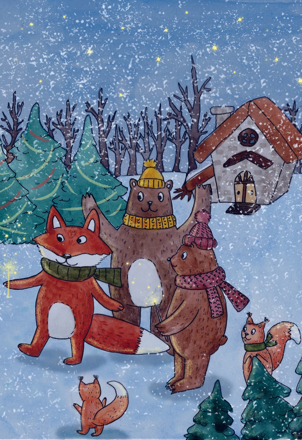 Из темноты выступили звери. Пожалуй, весь лес сбежался на звуки музыки и свет огней. Сегодня, в канун Рождества, все вместе – семейство зайцев рядом с лисами, белки удобно устроились в лапах медведя, олени позади волков. Малыши всех пород и мастей резвились отдельно от родителей. Праздничное настроение, царившее среди лесных жителей, отзывалось смехом и весельем. Ежеминутно слышались громкие взрывы хлопушек, усеявших поляну множеством разноцветных конфетти. Под одобрительный и восторженный гул голосов вспыхивали и гасли огненные салюты – даже жуки-пожарники сегодня были при деле.