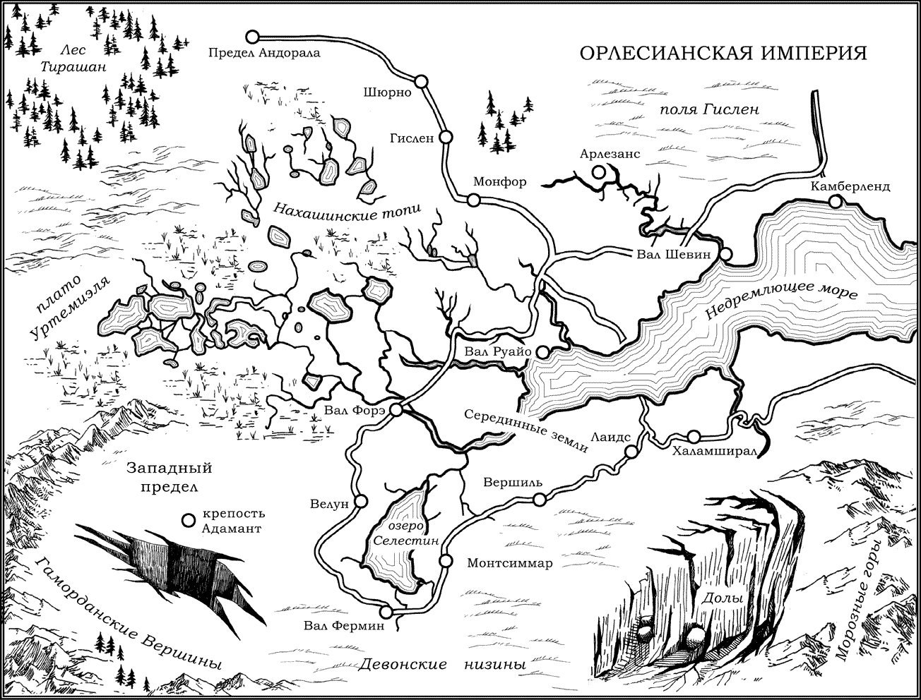 Императрица была облачена в атласное кремовое платье, отороченное нитями жемчуга и затейливо расшитое аметистами в золотой оправе, что несло цвета семьи Вальмон. То был наиболее легкий и удобный наряд среди тех, в которых императрица, следуя непреклонной воле этикета, могла появляться публично – не считая, само собой, прогулок верхом, – но тяжести этого платья было довольно, чтобы к вечеру у нее ныли спина и поясница. Селина изящно опустилась на сильверитовую скамеечку, как всегда тщательно следя за тем, чтобы ничем не выдать ни неприятных ощущений, ни облегчения.