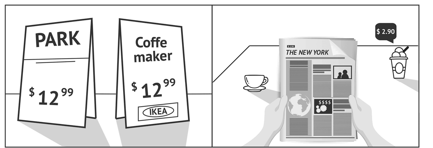 Не обязательно сравнивать свое предложение с аналогами прямых конкурентов. Пара примеров от Жива Кармона: IKEA сопоставляет стоимость кофемашины и стоимость парковки; New York Times, будучи одной из самых дорогих газет, сравнивает стоимость номера с мороженым.