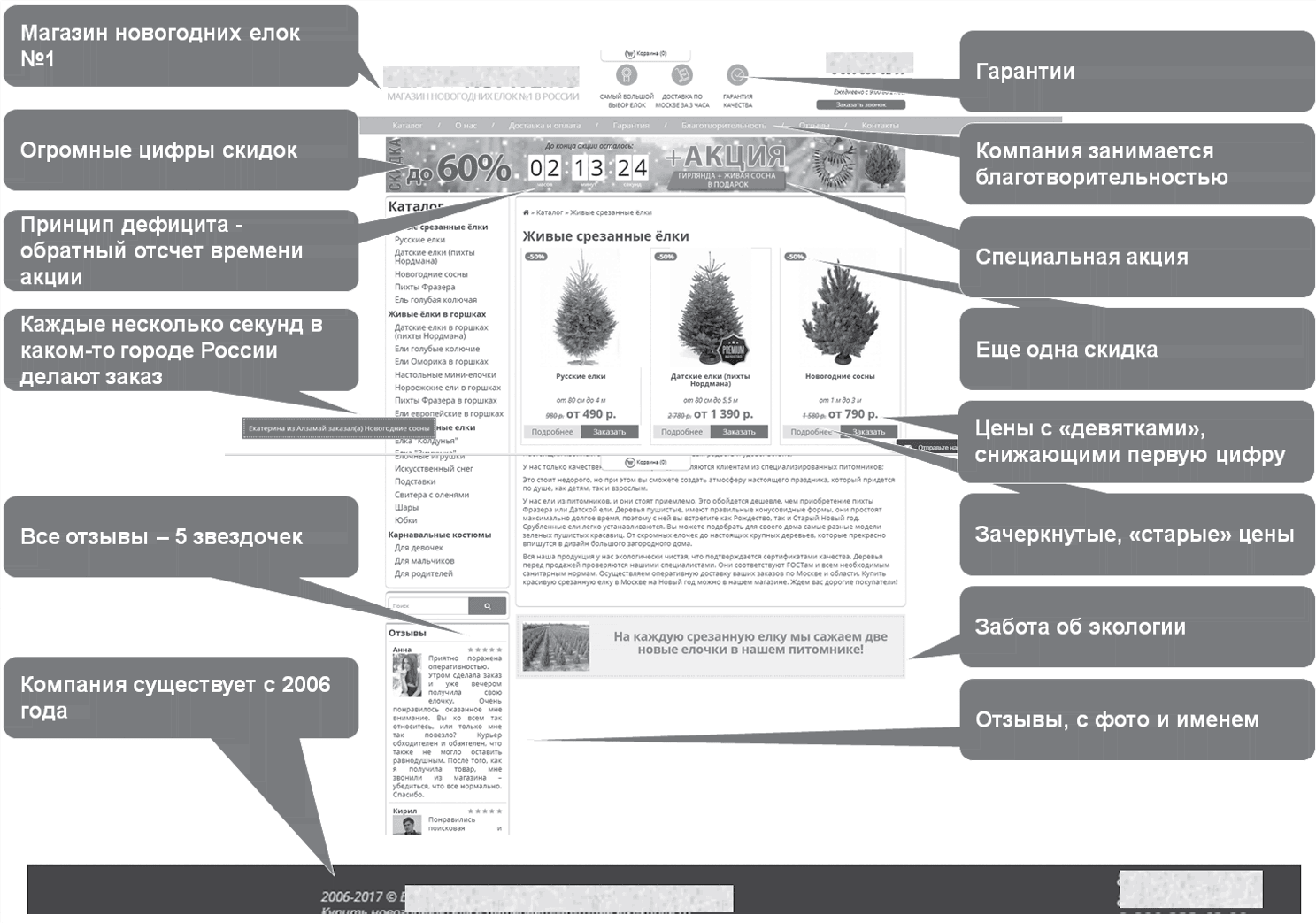 Расчет создателей сайта прекрасен. Елка обычно покупается в самый последний момент перед Новым годом, времени на раздумья нет. Все бьет в одну точку – срочность. Немедленно купить. Предполагается, что покупатель не станет тратить время на детальное изучение информации, его подсознание отметит слова-триггеры типа «гарантии» и «ответственность», а рука клацнет на корзину.