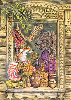 Лиса заохала, слезла с печи, а как за дверь вышла, откуда и прыть взялась! Вскарабкалась на полку и ну починать кадочку; ела, ела, всю верхушку съела, досыта наелась; закрыла кадочку ветошкой, прикрыла кружком, заложила камешком, всё прибрала, как у Медведя было, и воротилась в избу как ни в чём не бывало.