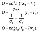 При стационарном режиме теплопередачи полный тепловой поток Q, переданный через однородную сферическую стенку от горячей среды к холодной, будет постоянным для всех изотермических поверхностей и может быть определен тремя уравнениями.