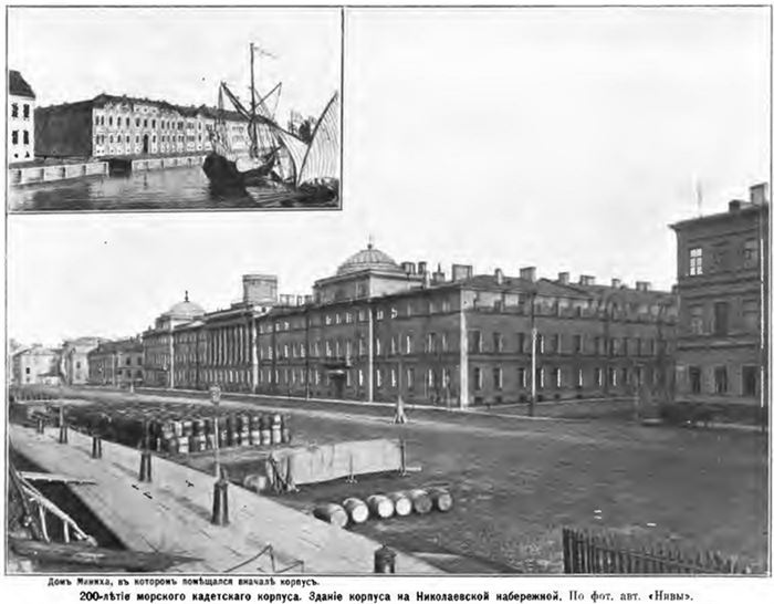 Огромное здание выходит на набережную между одиннадцатой и двенадцатой линиями Васильевского острова и тянулось по ним на весь квартал. Середину его составляет десятиколонный портик, поставленный на выступ первого этажа; справа и слева, в крыльях – две башни. Центр фасада увенчан цилиндрической будкой астрономической обсерватории, обшитой поверх железа наструганными досками, что изрядно портит парадный облик здания.
