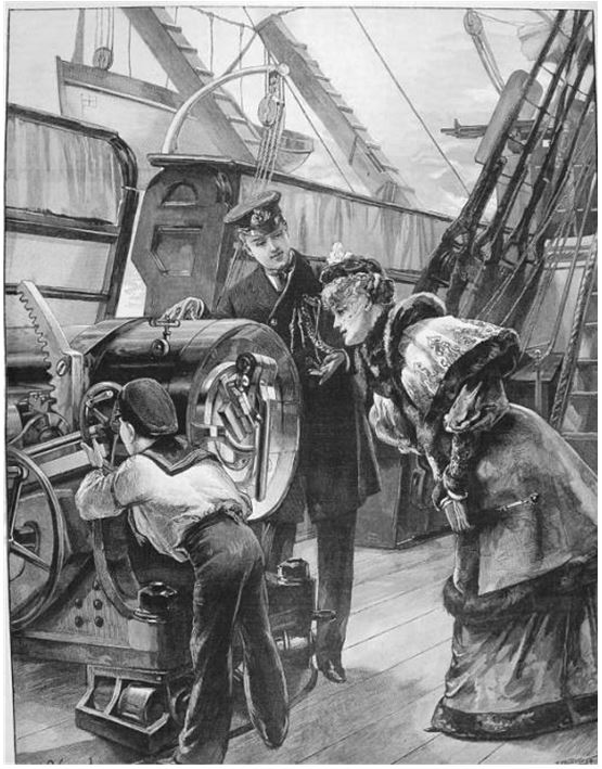 Корабль, о котором шла речь, и в самом деле, возвышался над водой всего на несколько футов. Дощатые мостки, перекинутые с пирса на палубу, были так сильно наклонены, что гостям приходилось судорожно цепляться за веревочное ограждение – леера. Двое матросов, дежуривших у сходней, подхватывали дам под локотки и передавали на палубу, где их встречал мичман при полном флотском параде.