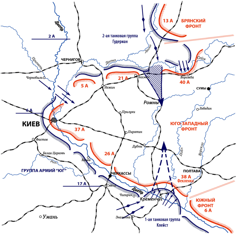 Убедившись в том, что, несмотря на взятие Смоленска, сломить упорное сопротивление советских войск не удается, командование вермахта сочло невозможным дальнейшее наступление на Москву без ликвидации угрозы с фланга, со стороны армий Юго-Западного фронта, которые все еще упорно обороняли киевский выступ. Двадцать четвертого августа танковая группа 1 Гейнца Гудериана, и пехотная армия Максимилиана фон Вейхса развернулись на юг и начали наступление с целью окружения русских войск, защищавших Киев. Ослабленные предыдущими боями советские дивизии не смогли остановить танковый кулак вермахта, но с востока во фланг моторизованным соединениям Гудериана все же наносились энергичные контрудары, отвлекавшие его силы и замедлявшие продвижение на юг. Возможно, с одним Гудерианом, даже поддержанным пехотой Вейхса, Юго-Западный фронт смог бы справиться, и, если и не победить, то хотя бы не дать себя окружить. Судя по всему, командование Красной Армии искренне верило в то, что этим ударом немцы и ограничатся, поскольку на южном фланге обороны Киева столь же мощной танковой группы у противника не имелось. На самом же деле советские генералы вновь недооценили способность вермахта к быстрым и неожиданным маневрам подвижными соединениями.