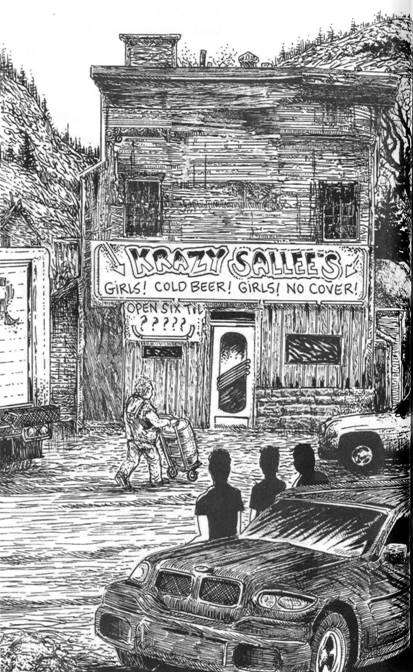 Оги указал на аляповатую вывеску под островерхой крышей, которая гласила: "ЧОКНУТАЯ СЭЛИ. ДЕВОЧКИ! ХОЛОДНОЕ ПИВО! ДЕВОЧКИ! ВХОД СВОБОДНЫЙ, ОТКРЫТО С ШЕСТИ И ДО УТРА". Надпись была окружена неоновой рамкой, которая с жужжанием источала мигающее оранжевое свечение, несмотря на то, что день был в разгаре.
