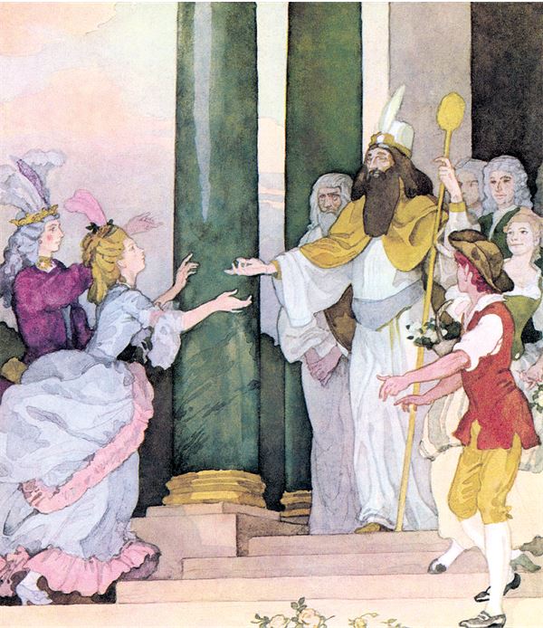 Перед ним появился роскошный королевский дворец. Принц сразу же узнал дворец своего отца. А вот и сам король, и рядом с ним королева, мать Тамино. Они простирают к сыну руки, умоляют его.