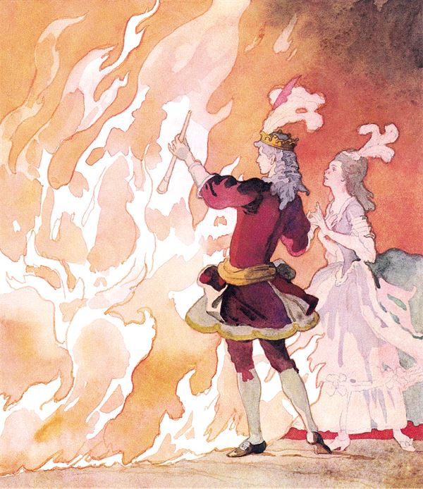 Впереди вспыхнуло и забушевало огромное пламя. Папагено в страхе упал на землю. А Тамино дунул в свою флейту и под её звуки бесстрашно шагнул навстречу огню.