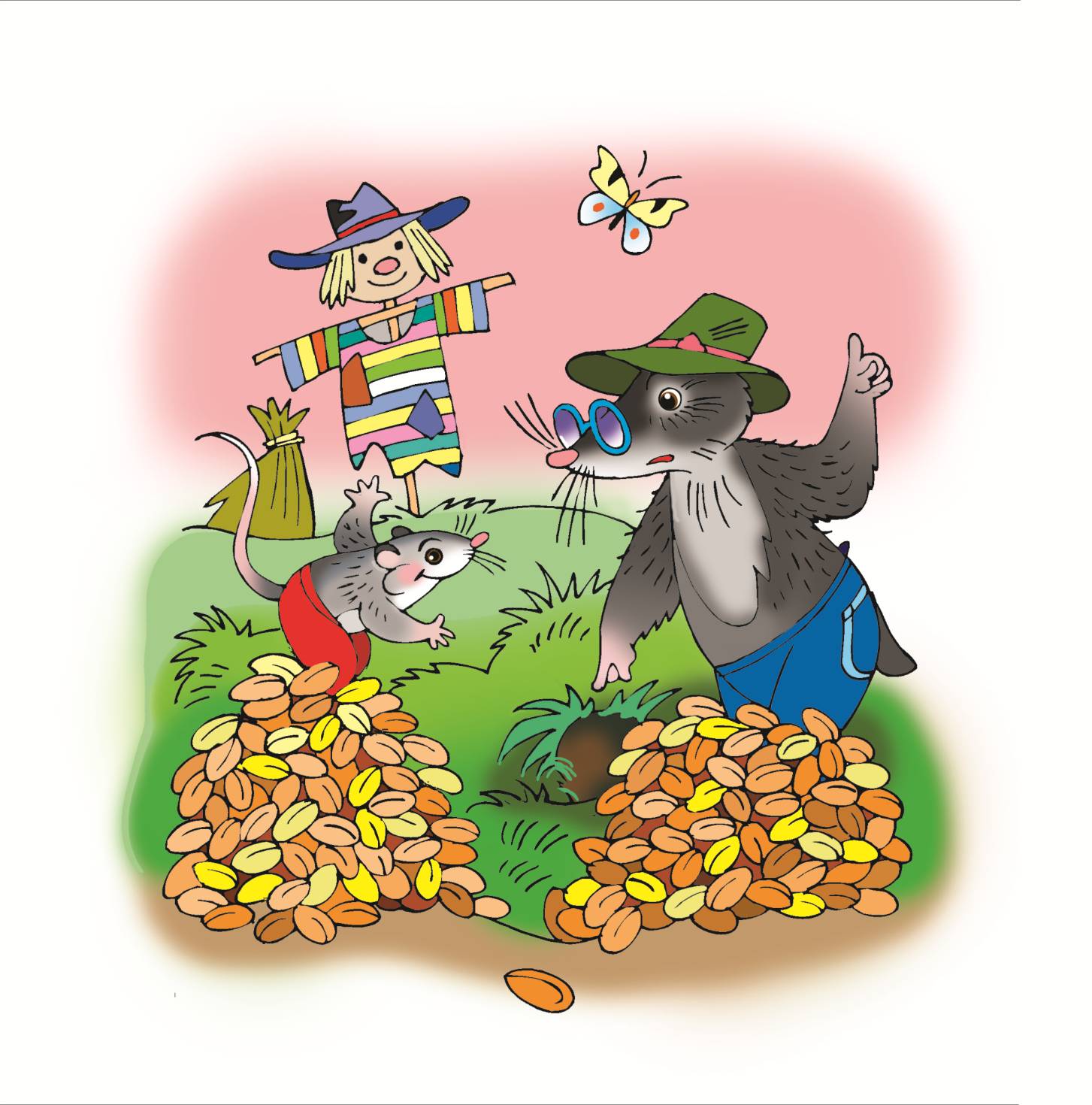 Натаскали Полевая Мышь и Крот зёрны-шек из пшеничного поля и сложили их между своих норок в одну кучку, чтоб разделить поровну.