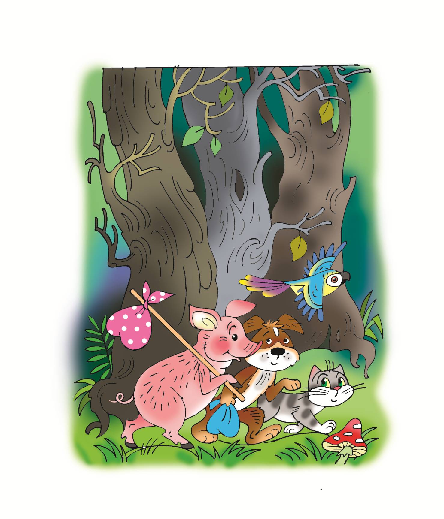 И отправились четверо друзей в путь. Прошли за околицу села и вошли в дремучий тёмный лес.