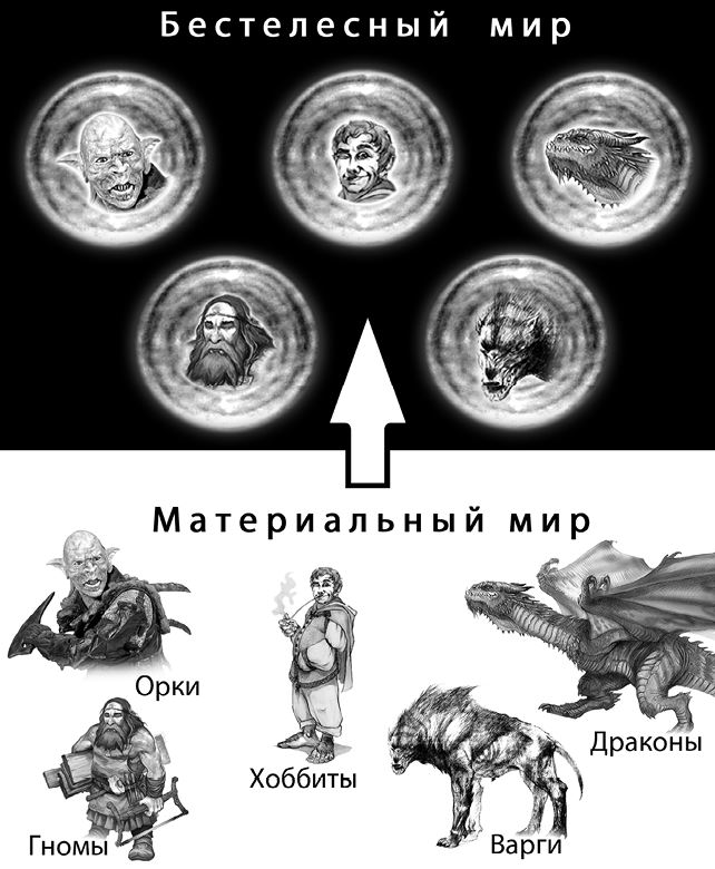 Так куда же делись эти гномы, хоббиты и драконы? Об этом ничего не говорится в «Сильмариллионе». Но… кое о чем можно догадаться. В этом писании представляется мир, где живут как телесные, так и бестелесные существа, способные принимать как материальный, так и бестелесный облик. То есть, это были МД-существа или «материализующиеся-дематериализующиеся существа». Поэтому вполне логично предположить, что все они в настоящее время, когда над разумным миром властвуют материальные люди (или мы), перешли в невидимый нами бестелесный мир, где до сих пор живут своей бестелесной жизнью и, возможно, только ждут того момента, когда материальные люди (или мы) ослабнут, чтобы, материализовавшись, показать всю свою страсть в борьбе за лидерство в жизни, которая… имеет два взаимосвязанных обличия: материальное и бестелесное.