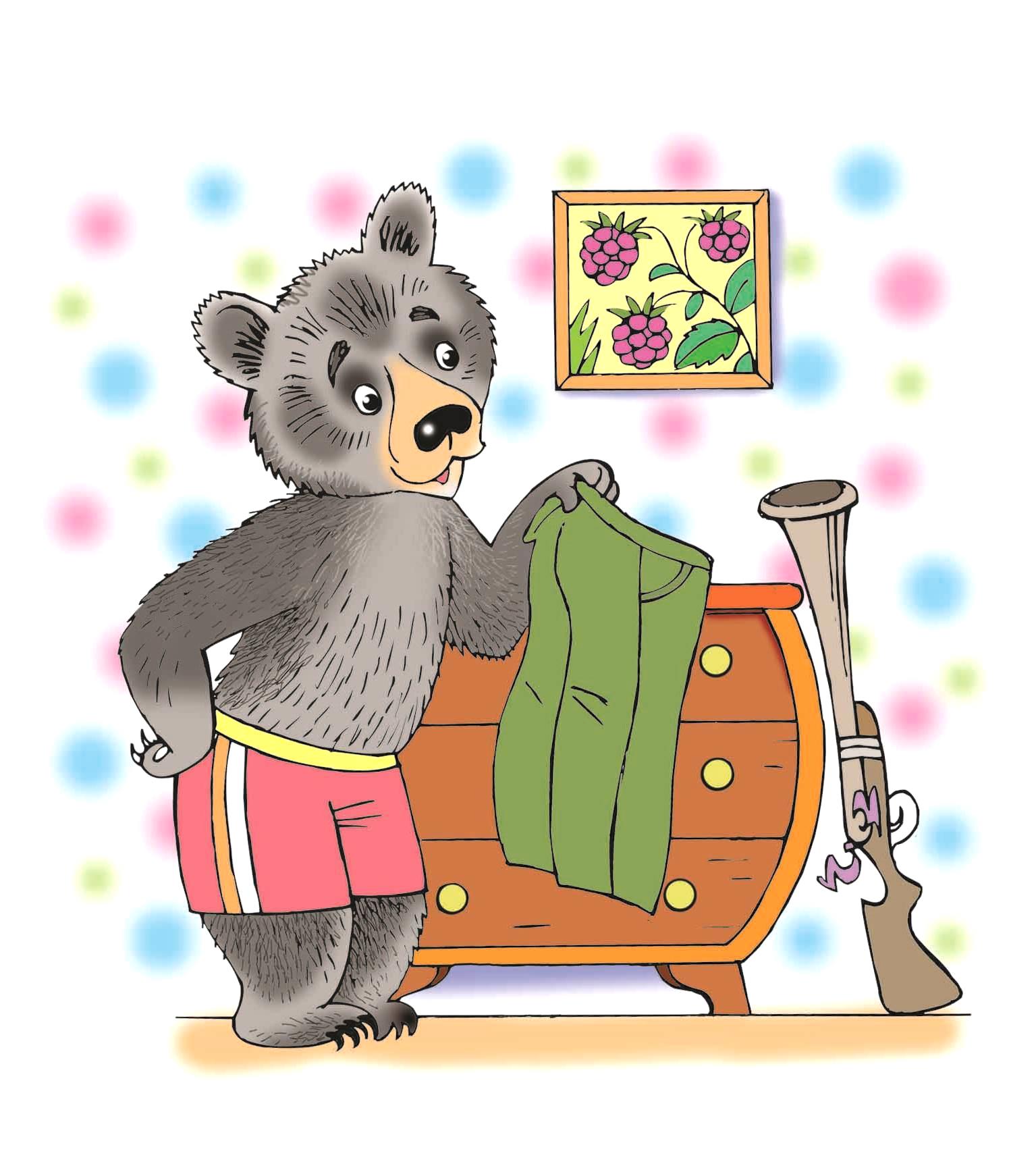 Из комода вынул брюки,