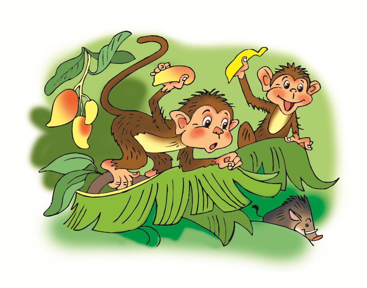 Испугались мартышки и стали кидаться плодами в свиное стадо, чтобы их отогнать.
