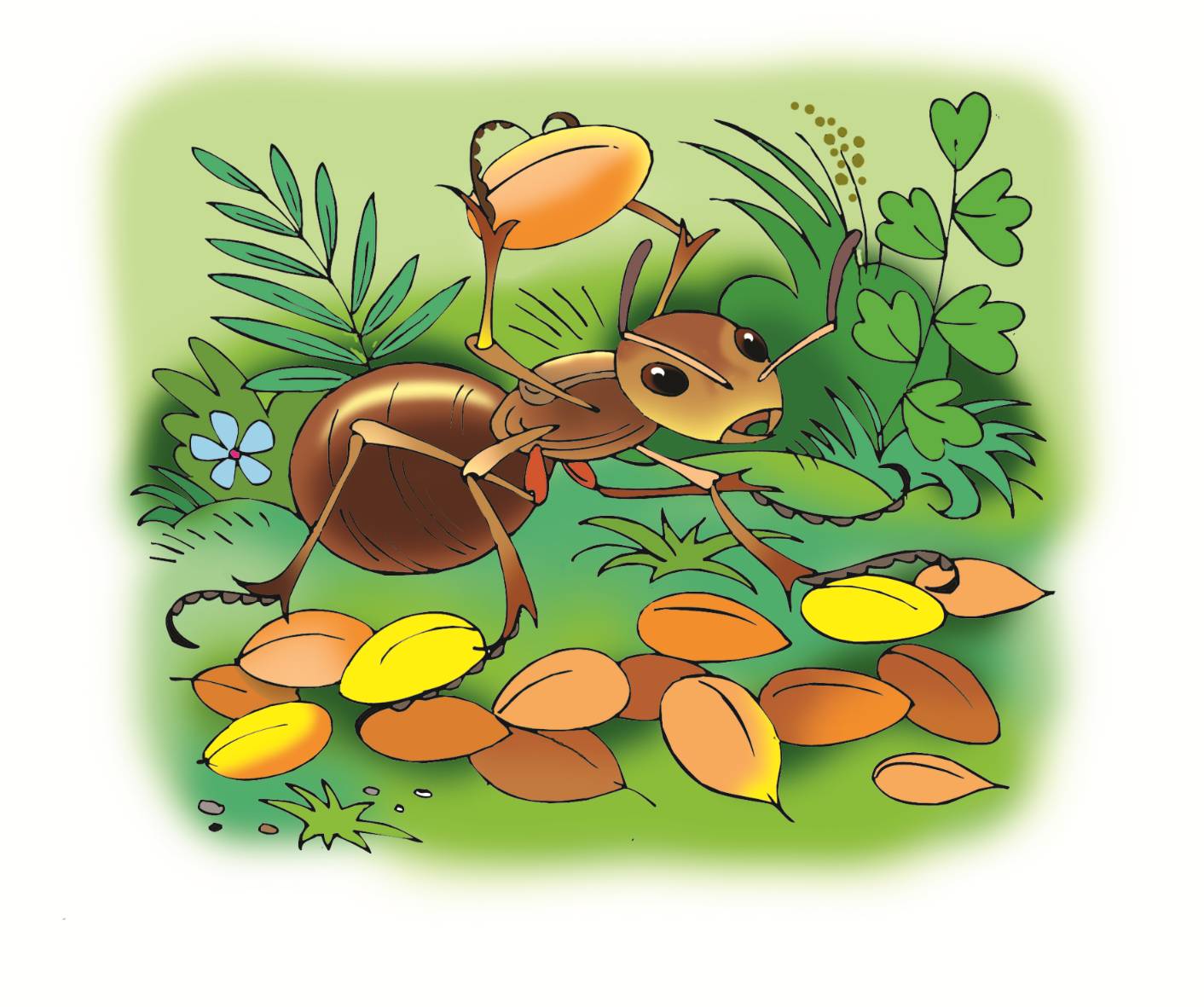 Увидел Муравей зерно, подбежал, поднял одно и потащил в муравейник.