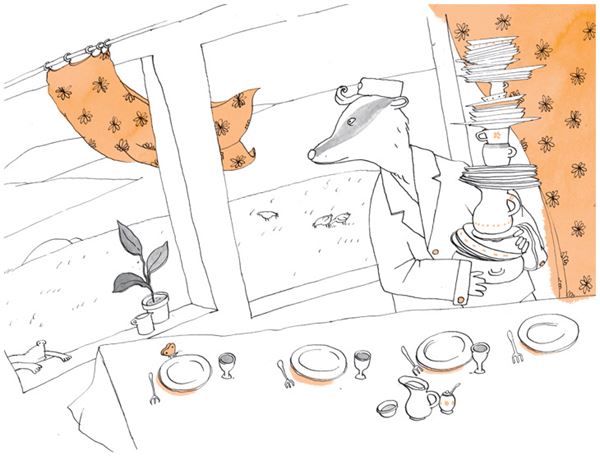 Внизу, в кухне на первом этаже, барсучиха Грета накрывала на стол, негромко напевая старую моряцкую песенку. На ней была бордовая форма коридорной, которую ей выдали, когда она поступила на работу в пансионат «Раздолье над фьордом». Изумительно нарядный костюмчик с лампасами на брюках и маленькими золотыми погончиками на плечах. На голове у нее была плоская шапочка, которую один из постояльцев принял как-то за коробочку из-под таблеток, но его поправили, и это воспоминание Грете было приятно.