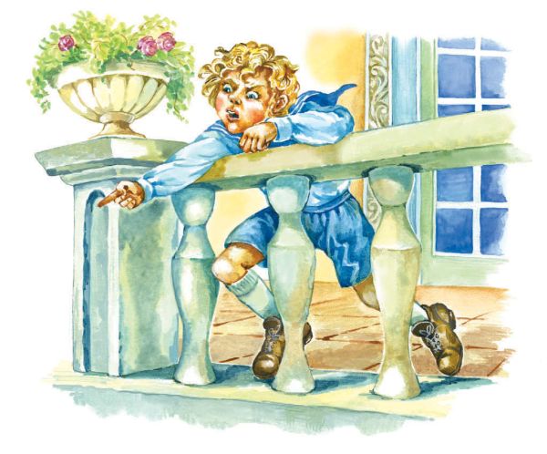 Дорожки сада были усыпаны ровным крупным гравием, хрустевшим под ногами, а с боков обставлены большими розовыми раковинами. На клумбах, над пёстрым ковром из разноцветных трав, возвышались диковинные яркие цветы, от которых сладко благоухал воздух. В водоёмах журчала и плескалась прозрачная вода; из красивых ваз, висевших в воздухе между деревьями, спускались гирляндами вниз вьющиеся растения, а перед домом, на мраморных столбах, стояли два блестящие зеркальные шара, в которых странствующая труппа отразилась вверх ногами, в смешном, изогнутом и растянутом виде. Перед балконом была большая утоптанная площадка. Сергей расстелил на ней свой коврик, а дедушка, установив шарманку на палке, уже приготовился вертеть ручку, как вдруг неожиданное и странное зрелище привлекло их внимание. На террасу из внутренних комнат выскочил как бомба, издавая пронзительные крики, мальчик лет восьми или десяти. Он был в лёгком матросском костюмчике, с обнажёнными руками и голыми коленками. Белокурые волосы, все в крупных локонах, растрепались у него небрежно по плечам. Следом за мальчиком выбежало ещё шесть человек: две женщины в фартуках; старый толстый лакей во фраке, без усов и без бороды, но с длинными седыми бакенбардами; сухопарая, рыжая, красноносая девица в синем клетчатом платье; молодая, болезненного вида, но очень красивая дама в кружевном голубом капоте и, наконец, толстый лысый господин в чесучовой паре и в золотых очках. Все они были сильно встревожены, махали руками, говорили громко и даже толкали друг друга. Сразу можно было догадаться, что причиной их беспокойства является мальчик в матросском костюме, так внезапно вылетевший на террасу.