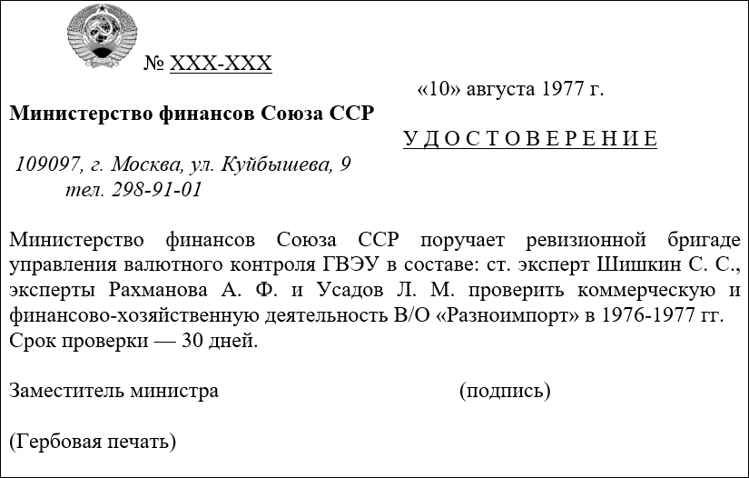 Вот с таким солидным удостоверением в руках я звоню в секретариат «Разноимпорта», представляюсь и прошу назначить встречу с руководством. На вопрос о цели встречи цитирую удостоверение: проверка коммерческой и финансово-хозяйственной деятельности объединения. В трубке наступает понятное молчание, а через минуту секретарша любезно просит прийти к председателю через два дня. Эта задержка мне кажется несущественной, тем более что я чувствую себя в новом качестве неуверенно, хотя и стараюсь не подавать виду своим подчинённым. В нашем первом отделе мы берём справки о допуске к работе с секретными и совершенно секретными документами и в назначенное время поднимаемся на четвёртый этаж правого крыла высотного дома на Смоленской площади.