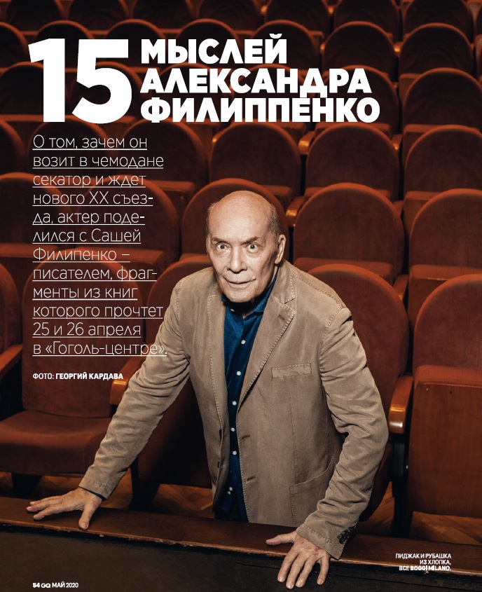 О том, зачем он возит в чемодане секатор и ждет нового XX съезда, актер поделился с Сашей Филиппенко – писателем, фрагменты из книг которого прочтет 25 и 26 апреля в «Гоголь центре» .