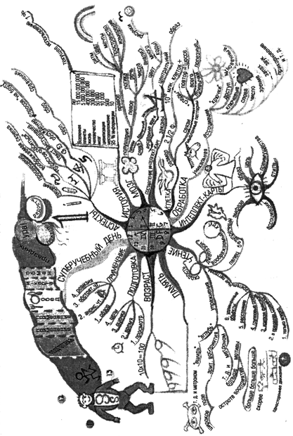 Интеллект-карта была составлена Барри Бьюзеном для лекции, с которой он выступал перед собранием академических работников и служащих внешнеполитического ведомства. Тема лекции, указанная в центре карты, была утверждена организаторами мероприятия, и посему лектор решил не превращать ее в специфический центральный образ. На интеллект-карте можно встретить немало кодовых слов, указывающих на области знания или идеи других авторов, с которыми знаком лектор. Обратите внимание на линейную архитектуру; использованную автором, которая предлагает альтернативный способ размещения первичных и вторичных по значению ветвей. На основе такой интеллект-карты достаточно квалифицированный лектор способен говорить сколь угодно долго, будь то десять минут или десять часов. Любая из главных ветвей могла бы сама по себе стать основой для отдельной лекции, а вся интеллект-карта – для целого курса лекций. Другим применением рассматриваемой интеллект-карты могла бы стать (и стала) лекция в университете. Кроме того, ее можно было бы (но в данном случае этого не случилось) использовать как предварительный набросок для публицистической статьи.