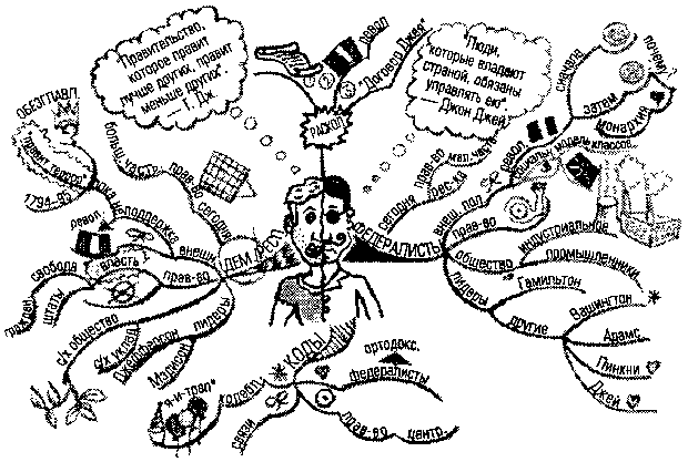Центральным образом становится основная тема мероприятия (узкой деловой встречи или семинара), а главными ветвями – основные пункты повестки дня или программы. По мере развития событий вы имеете возможность дополнять интеллект-карту идеями и информацией по своему усмотрению. Как один из вариантов – можно посвятить отдельную мини-интеллект-карту каждому выступлению. При условии, что все такие мини-интеллект-карты располагаются на одном и том же большеформатном листе бумаги, не представит трудности снабдить карту в целом необходимыми перекрестными ссылками по мере разработки той или иной общей темы.